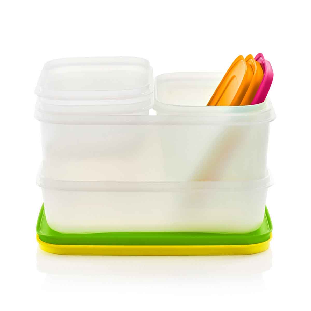 Бортик на крышке и ножки на дне контейнера позволяют ставить их друг на друга.